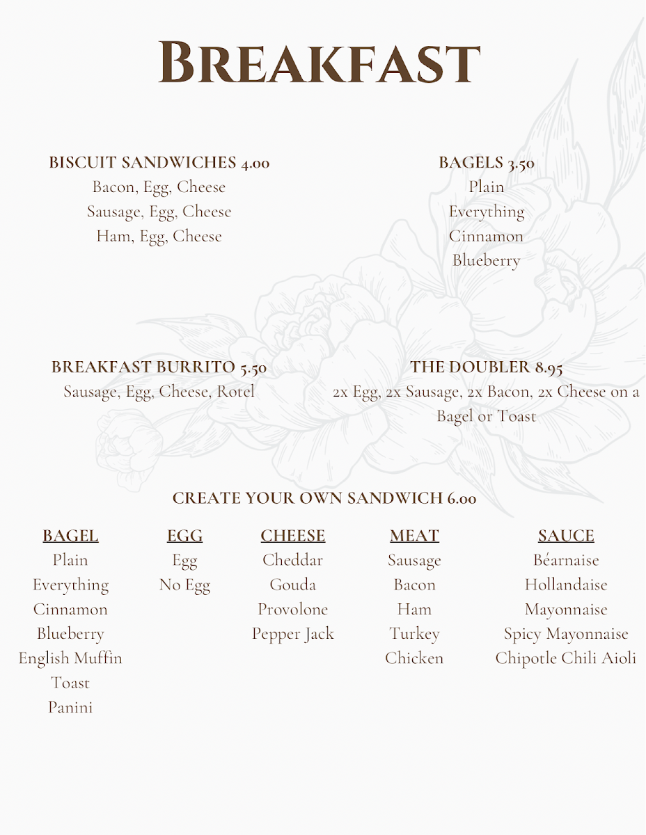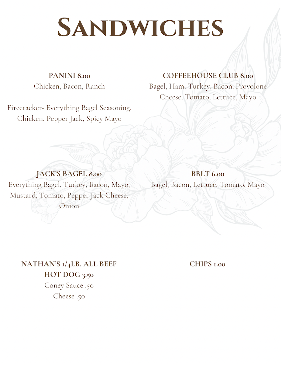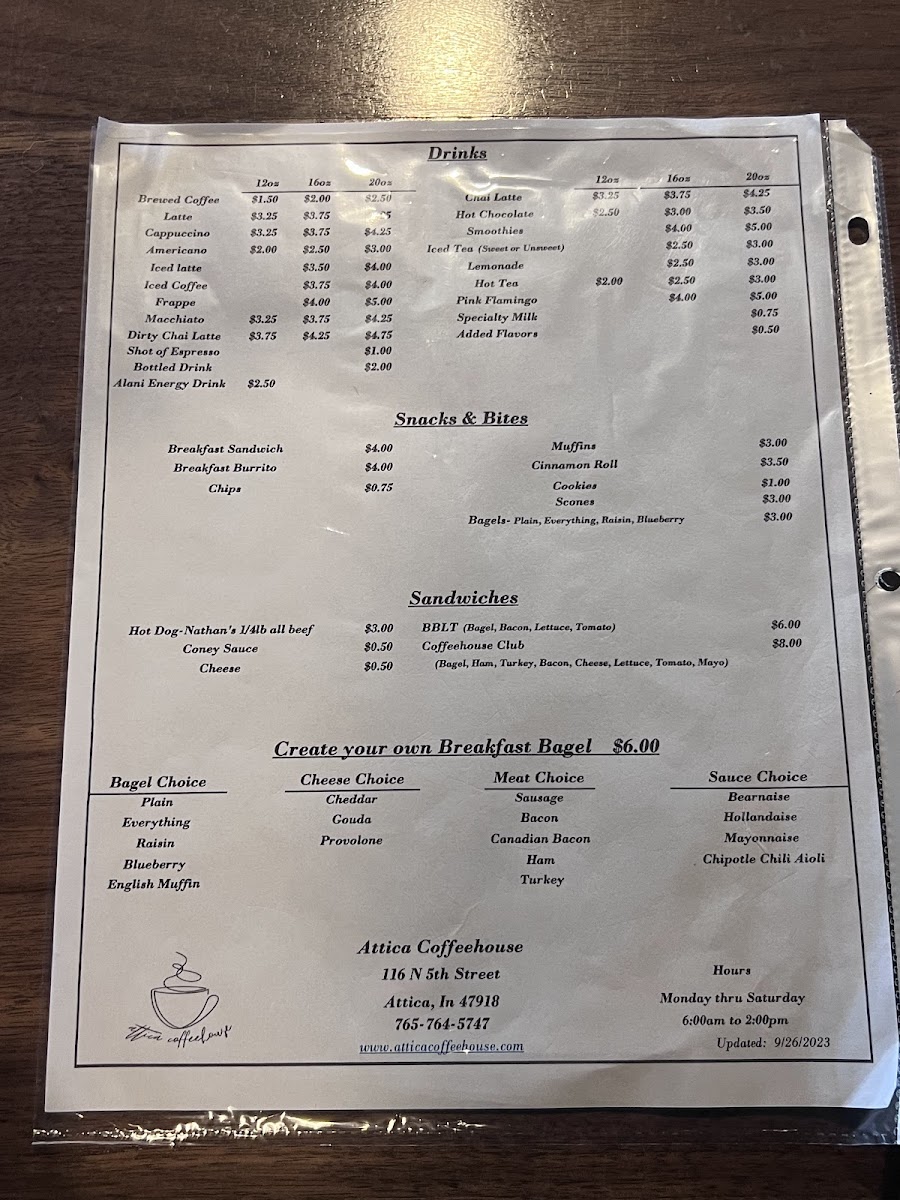 Attica Coffeehouse offers a diverse and satisfying menu that caters to a variety of tastes. For breakfast, guests can indulge in a variety of Biscuit Sandwiches or Bagels, or opt for something more filling like the Breakfast Burrito The Doubler. If you’re in the mood for something customized, the Create Your Own Sandwich is the perfect choice. For lunch, the sandwich selection is just as varied, with options like the classic Panini, the savory Coffehouse Club, or the delicious Jack’s BagelBBLT. If you're craving something heartier, try Nathan’s 1/4lb. All Beef Hot Dog. Adding a touch of sweetness to your drink, Attica offers a wide array of syrups, including Amaretto, Blueberry, and Caramel, among others. The beverage selection includes all-time favorites like Brewed Coffee, Cold Brew, and various espresso-based drinks such as Hot Latte, Iced Latte, and Cappuccino, ensuring there’s something for every coffee lover. With such a well-rounded menu, Attica Coffeehouse makes for a delightful stop whether you're looking for a quick bite or a relaxing drink.